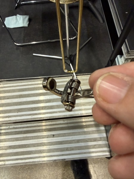I’m still playing the same Olds trombone my parents bought me for Christmas* in the 10th grade. About two decades ago, the original spit valve popped off. I wound some electrical tape around the hole and was quite content with that, but two years ago I decided “I should have this thing cleaned once every forty years” and took it in to the shop for a thorough ultrasonic debunking, and they also installed a new spit valve. Which worked great until Tuesday.